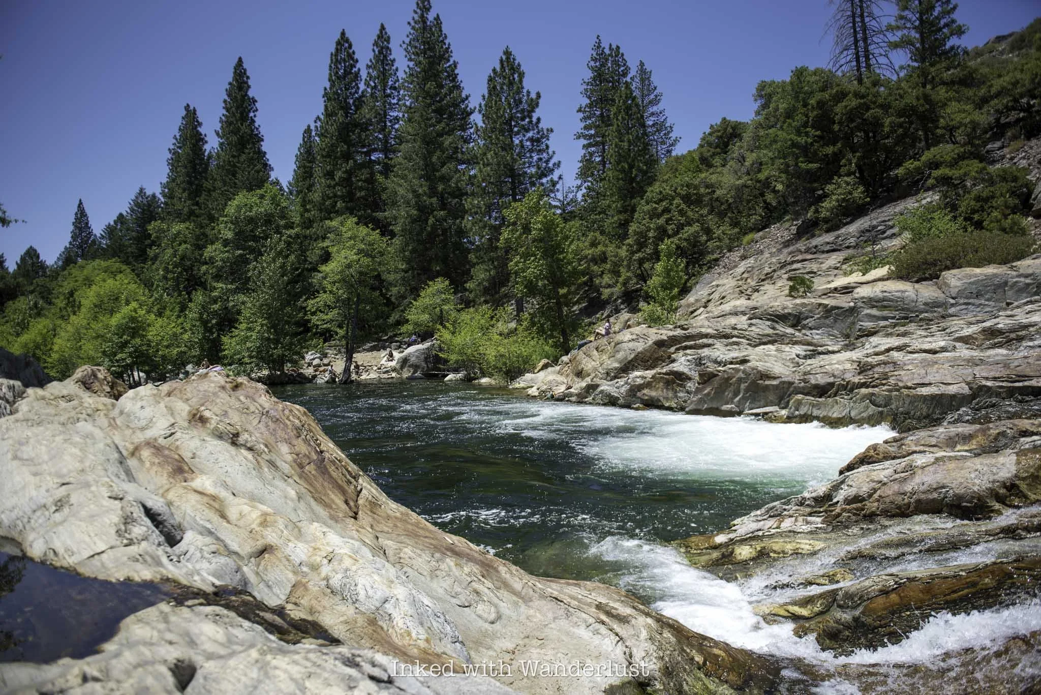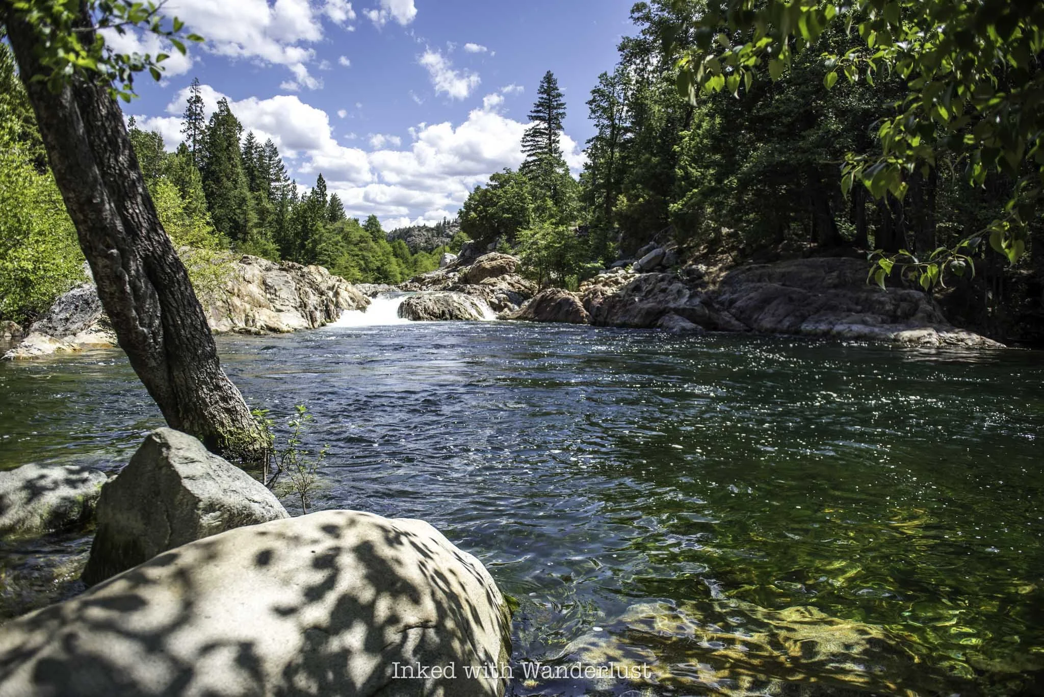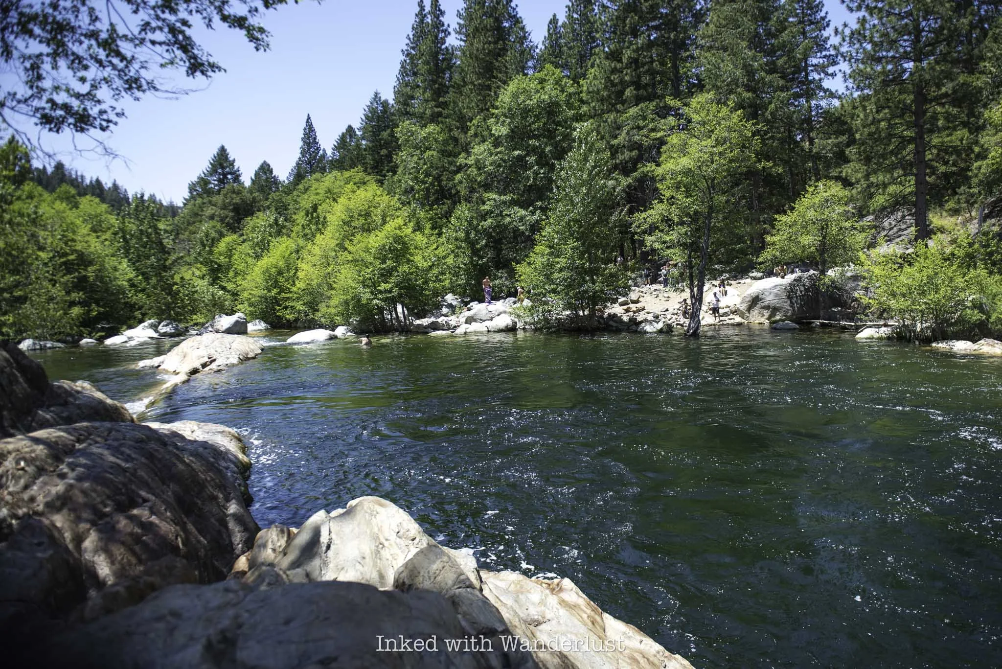 If you’re here in the spring when Yuba River is roaring with fresh snowmelt, the pool will be rather full and deep in some spots. The water level actually rises into the shoreline, covering the base of a tree.
