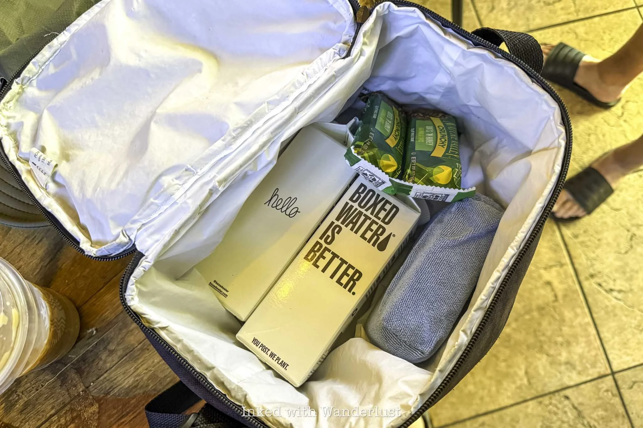 In the goodie sack you’re given you’ll find two boxes of water, a couple Nature Valley granola bars, and a towel to use to wipe the sand out of your clear kayak. Not sure if these are the exact items given every time, but that’s what was given to my Dad and me.