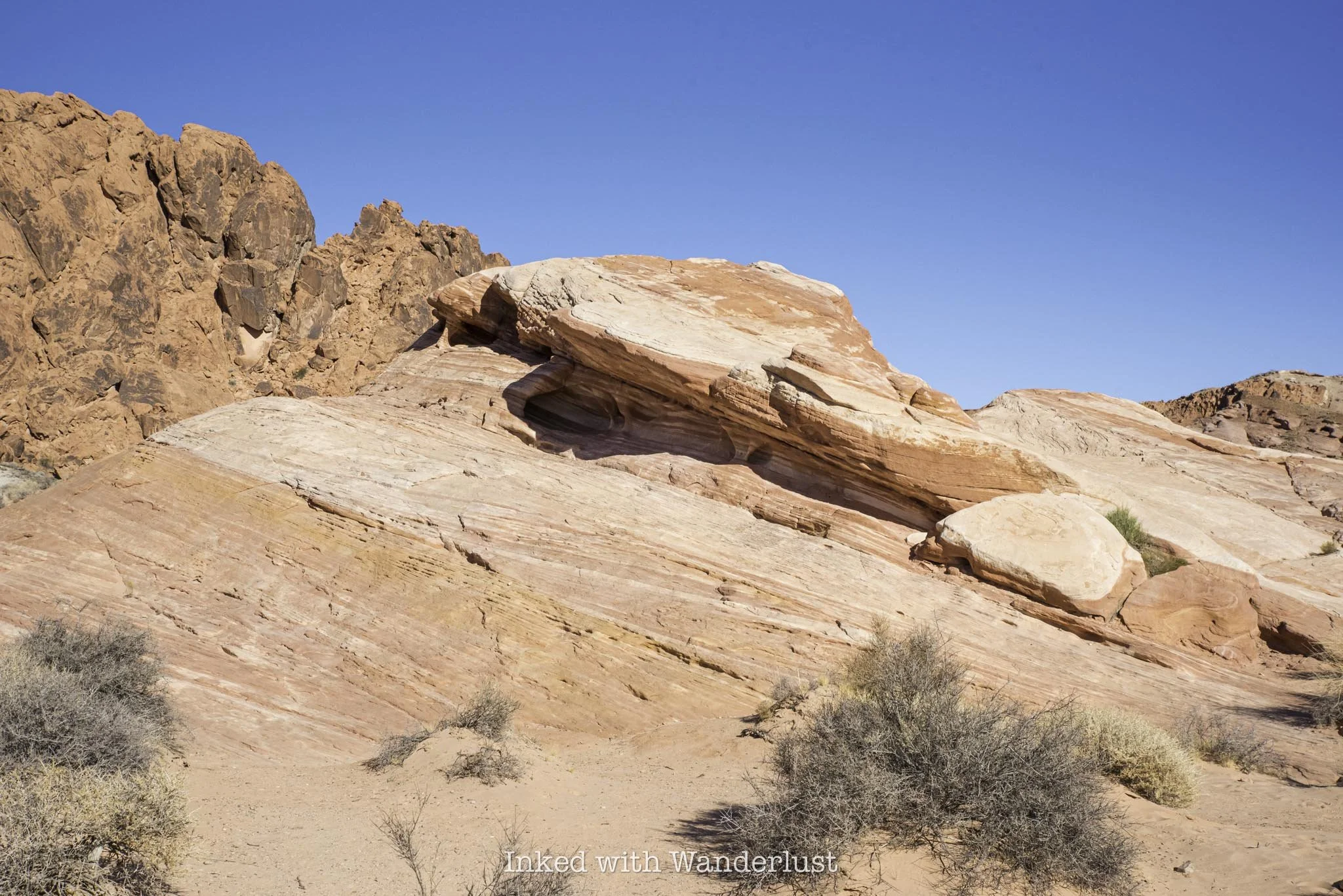 As you get up against the huge sandstone rock, the trail turns to dirt and begins a slight descent to the right. You’re still cutting through heavy sagebrush fields, but you’ll also start to see more of the unique sandstone rock formations Valley of Fire is famous for.