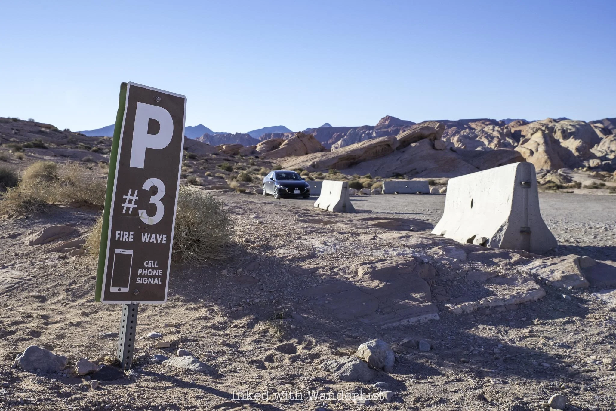 There are two gravel lots where you can park for Fire Wave, one on either side of the road. They’re both gravel and dirt, and are large enough to accommodate many vehicles. Sunrise and (especially) sunset are times when parking can be most competitive, as those are Fire Wave’s most popular times.