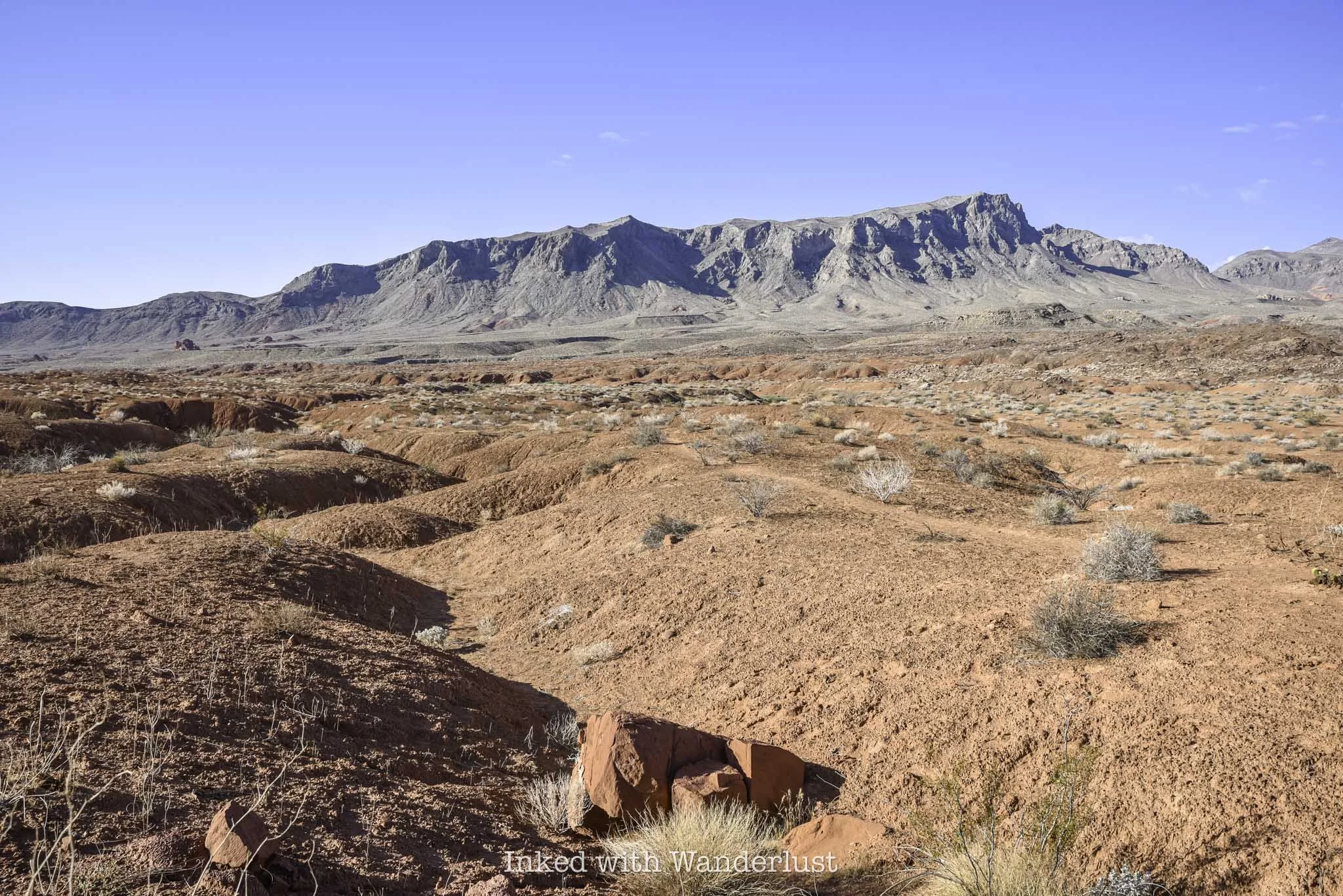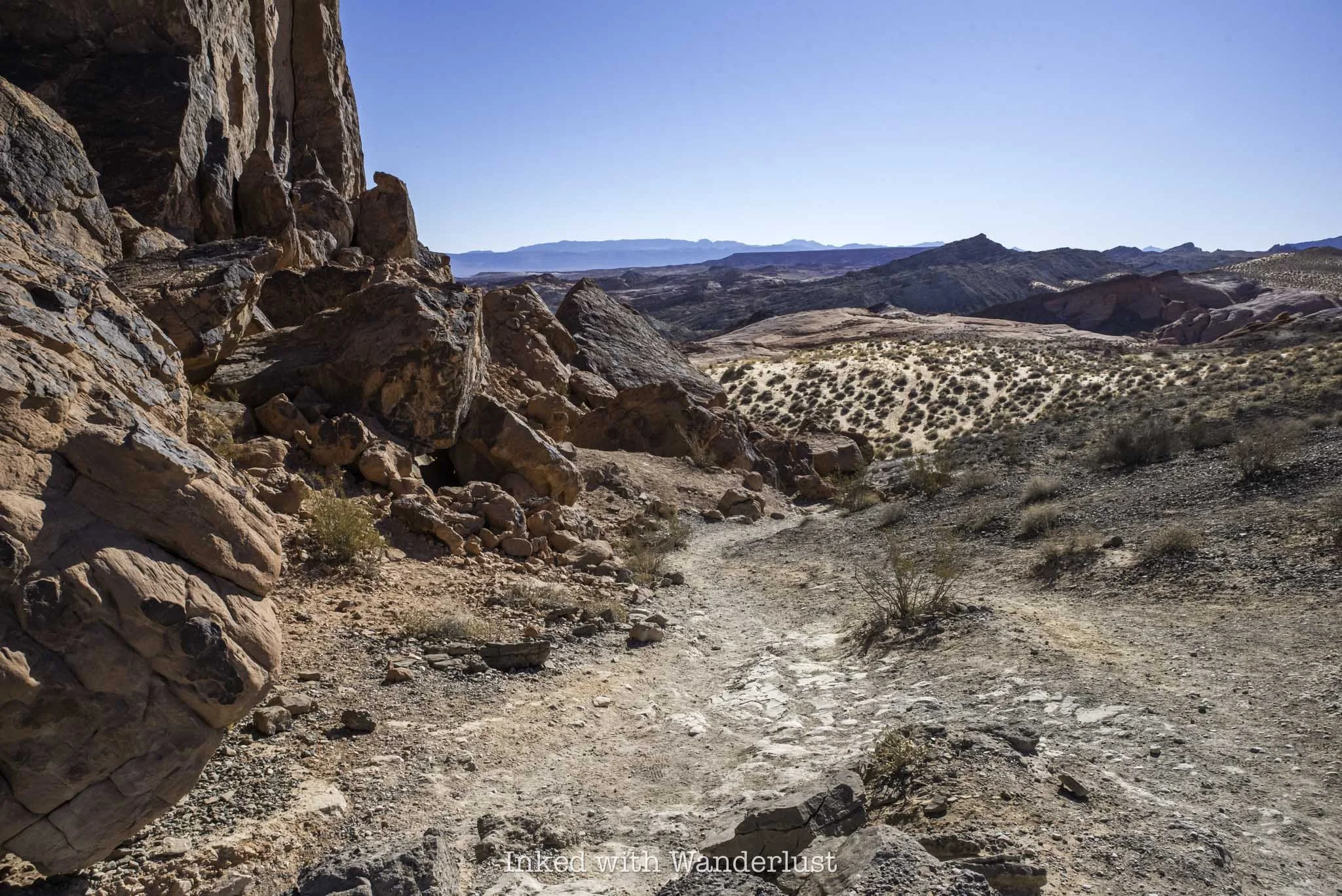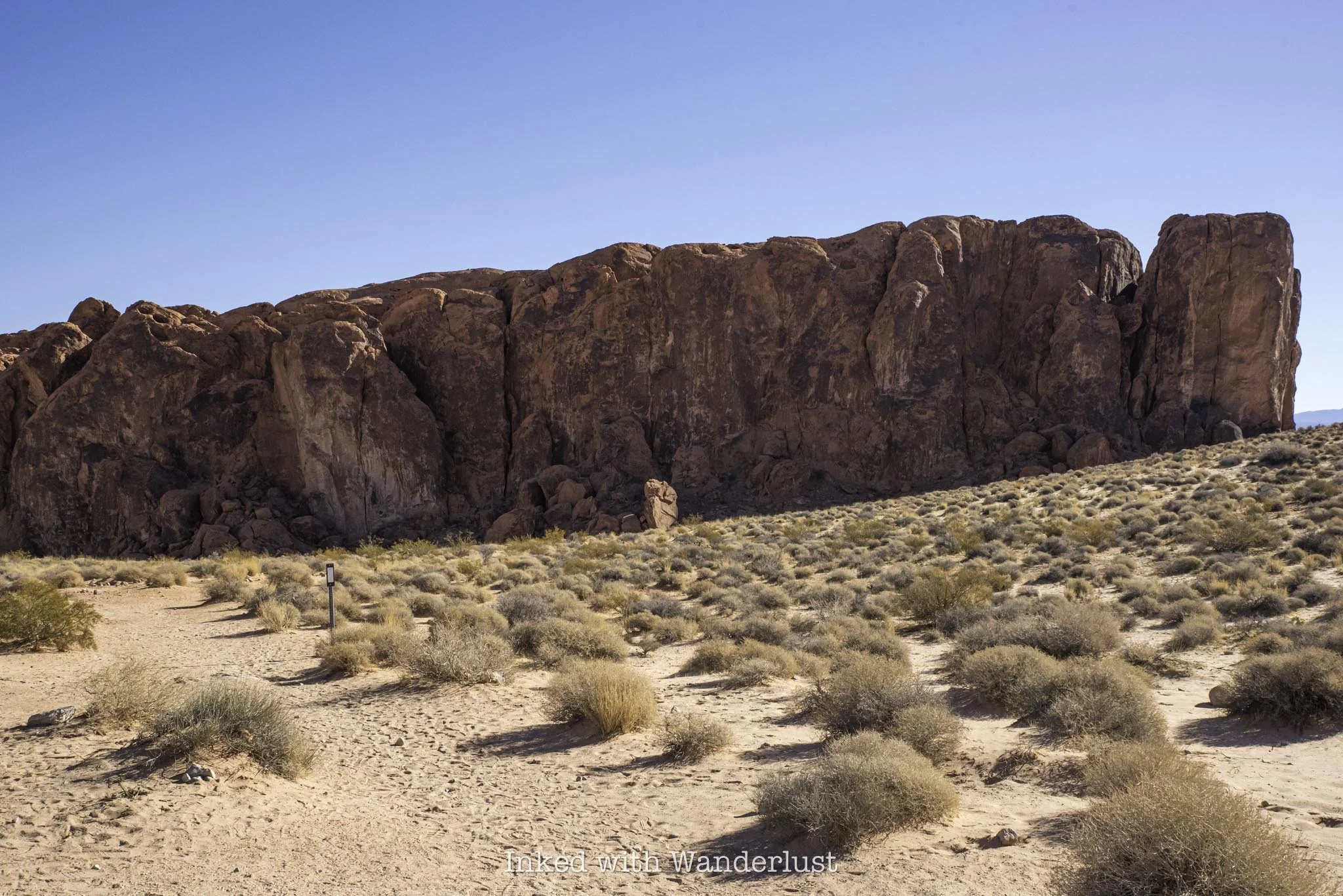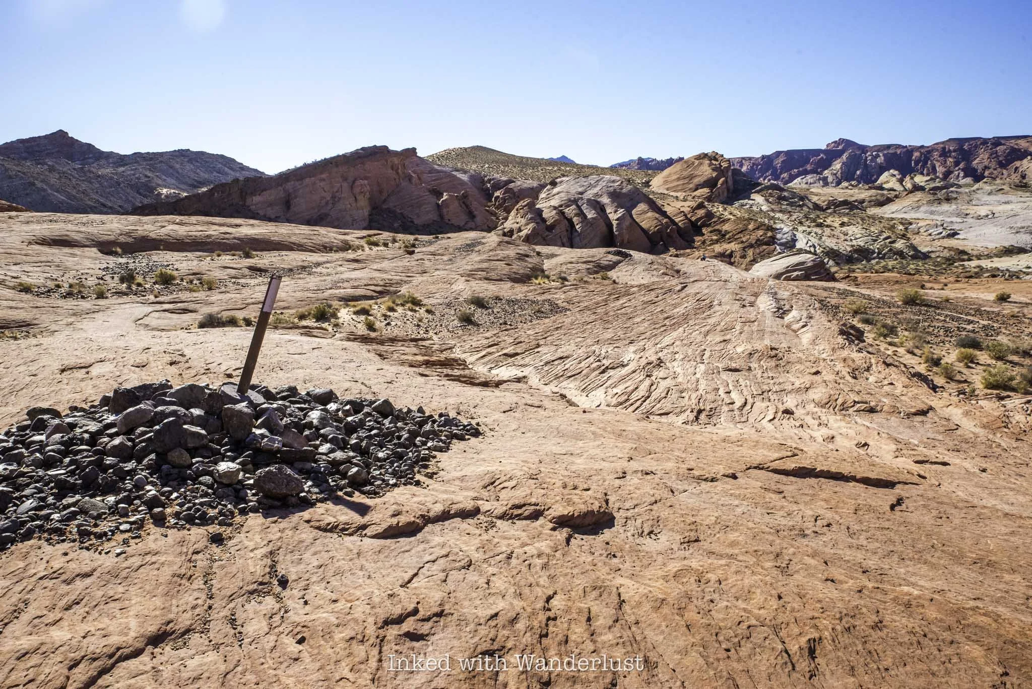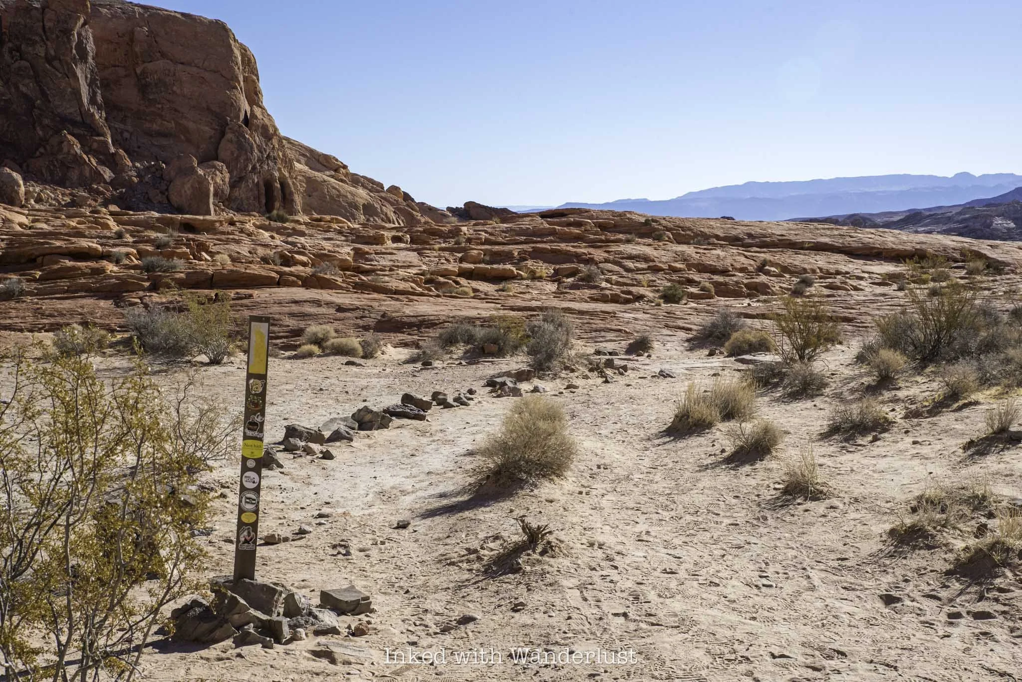To find the trailhead, simply walk between the brick structure and the Valley of Fire photo opp sign on the right. You’ll find the trail behind the structure leading towards the sandstone ridge in the distance.