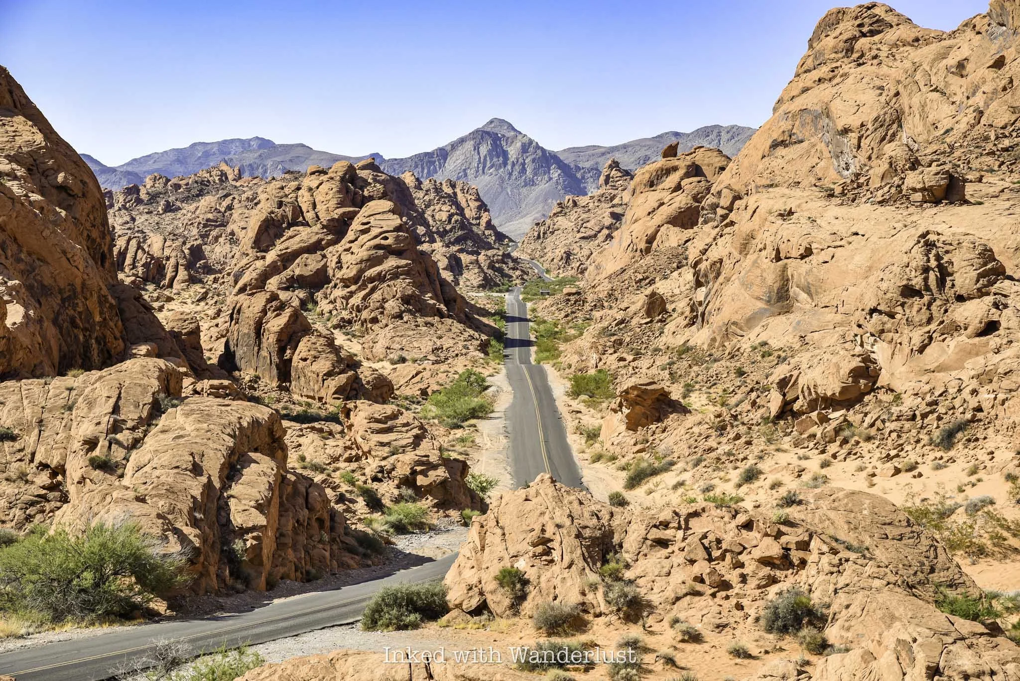 After a short distance, you’ll soon be surrounded by those reddish/orange rock canyon walls Valley of Fire is famous for. There isn’t much in the way of trees or greenery, just the usual desert brush.